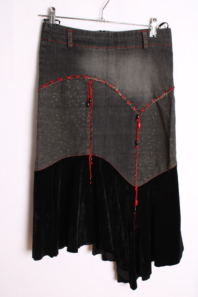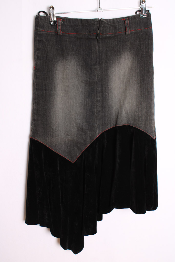 Falda de largo midi asimétrica en tono negro/gris en tejido denim y terciopelo con detalles cinta en rojo.