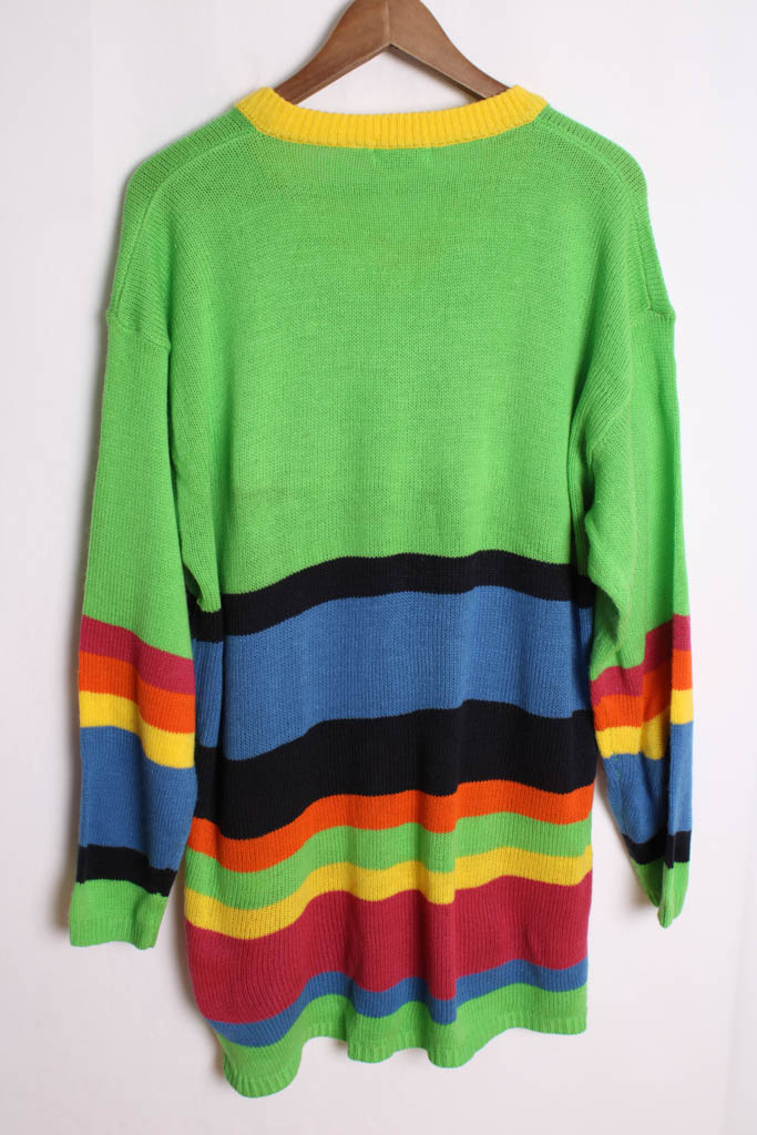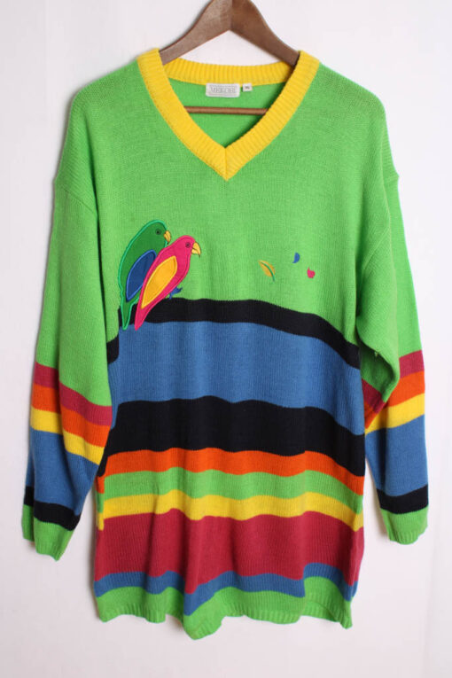 Jersey vintage para mujer en color verde con rayas de colores y estampado de pájaros.