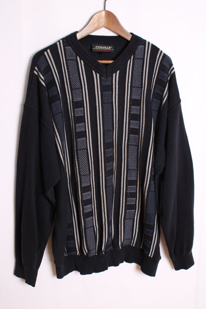 Jersey vintage para hombre en color azul marino con detalles verticales con cuello de pico.