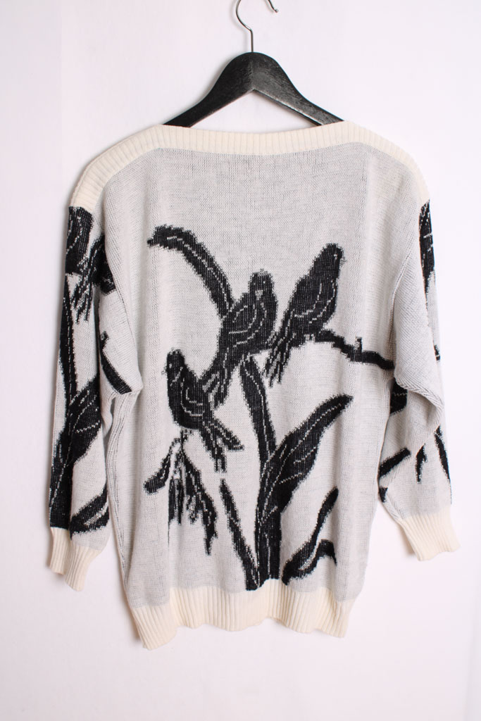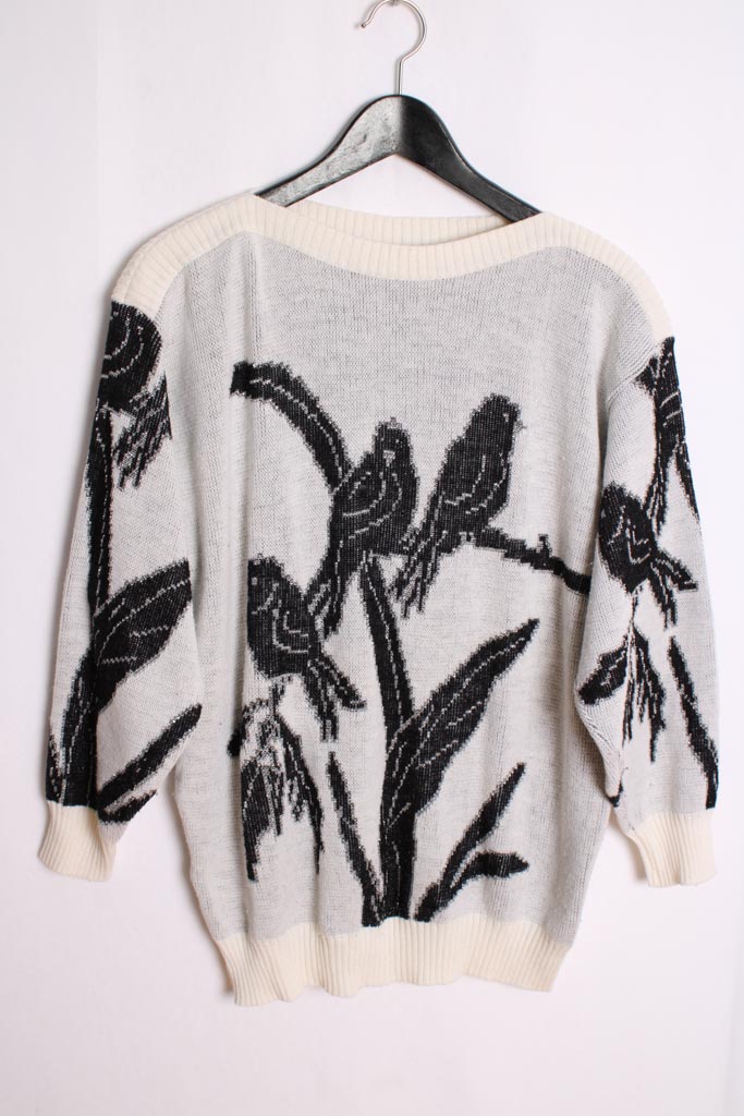 Jersey vintage para mujer en color blanco con estampado  de pájaros negros con brillos palteados.