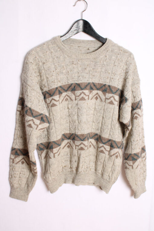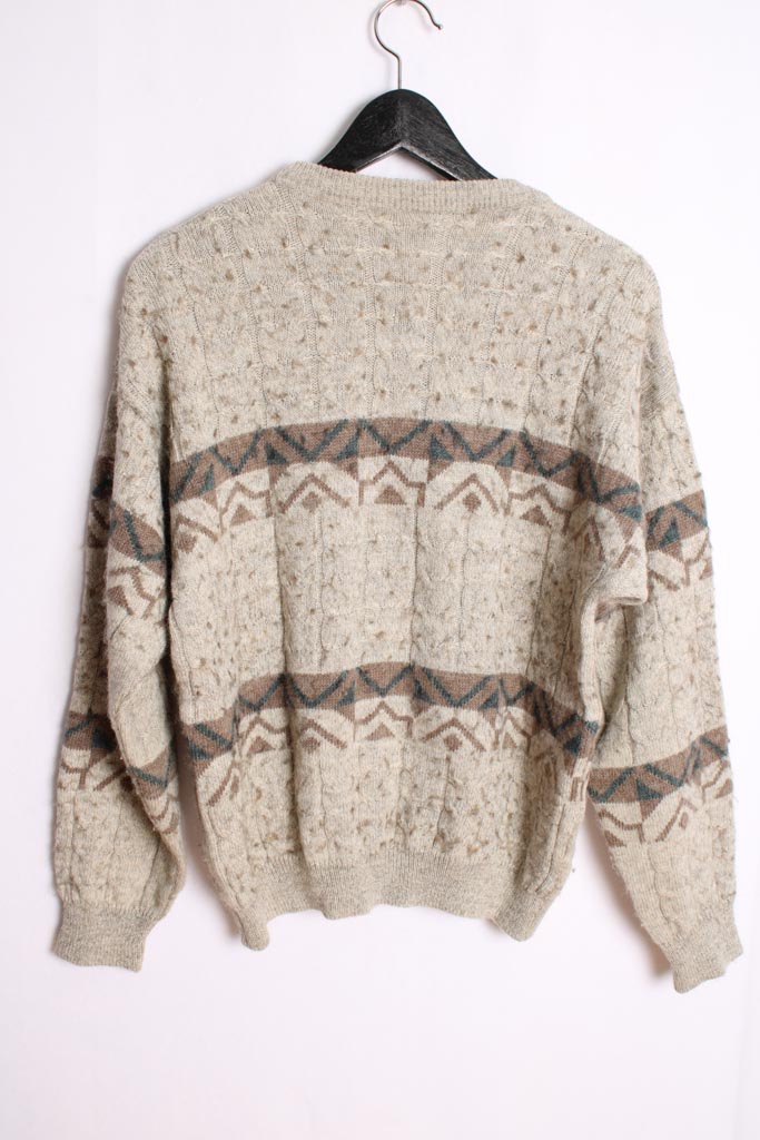 Jersey vintage de invierno para hombre en color gris con coletas y cenefas en tonos verdes.