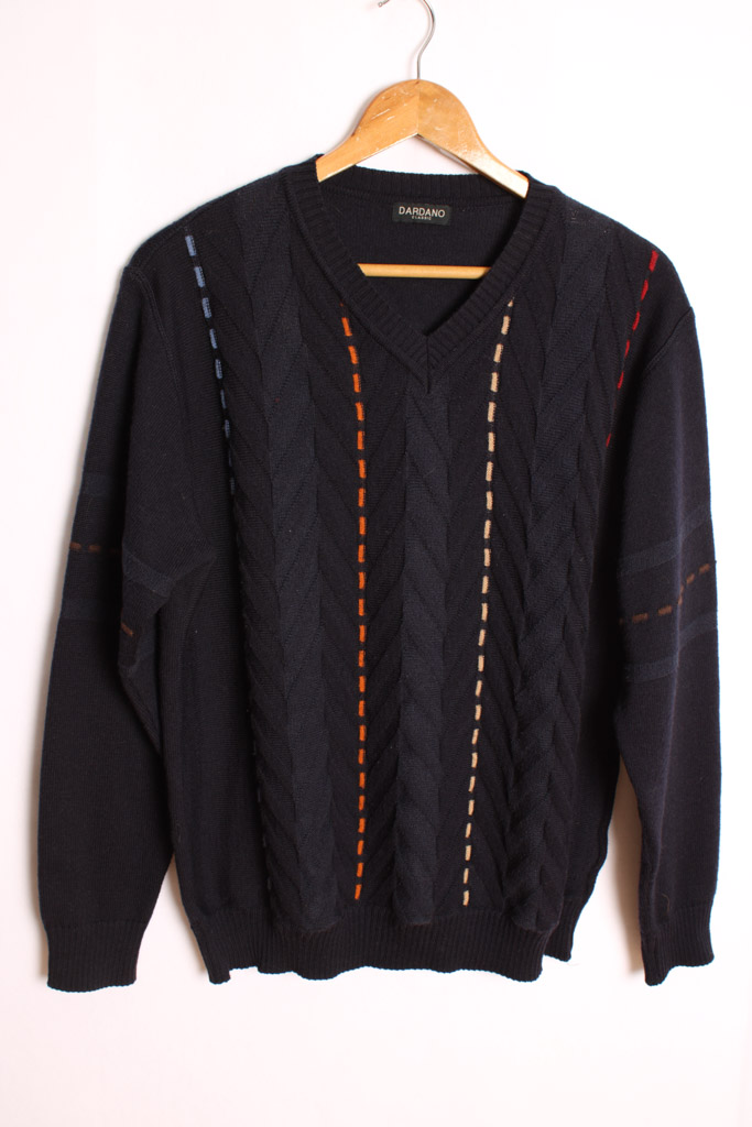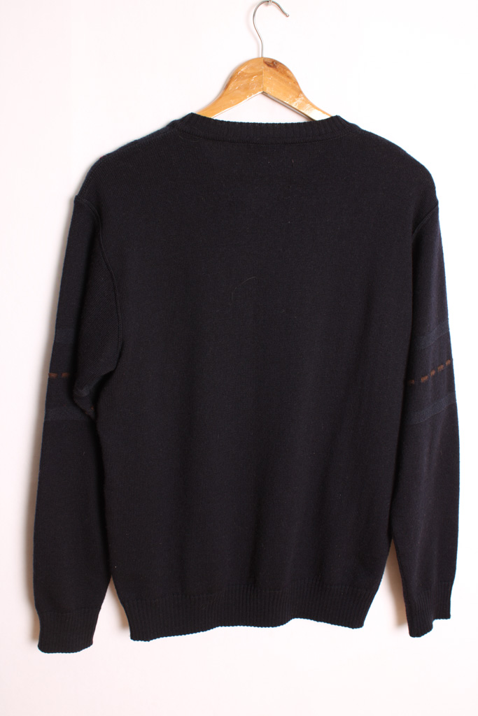 Jersey vintage en color azul marino con detalles de colores y espiga acanalada en el pecho.