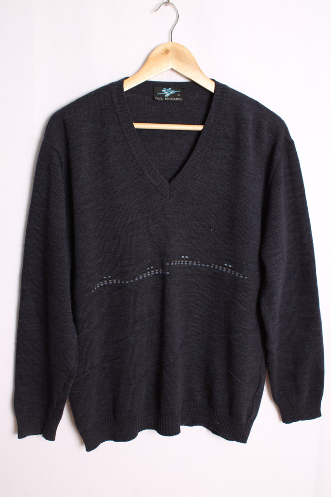 Jersey vintage de hombre en color azul con cuello de pico y detalles geométricos.