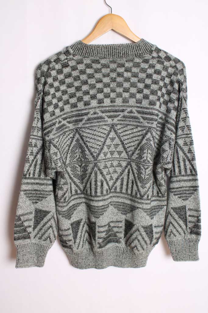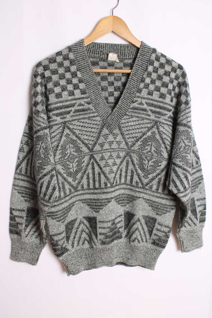 Jersey vintage de hombre en tonos grises con estampado geométrico y cuello de pico.