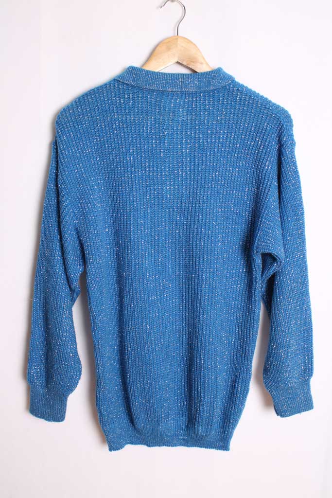 Jersey vintage para mujer con cuello polo en color azul y  tejido de brillos plateados.