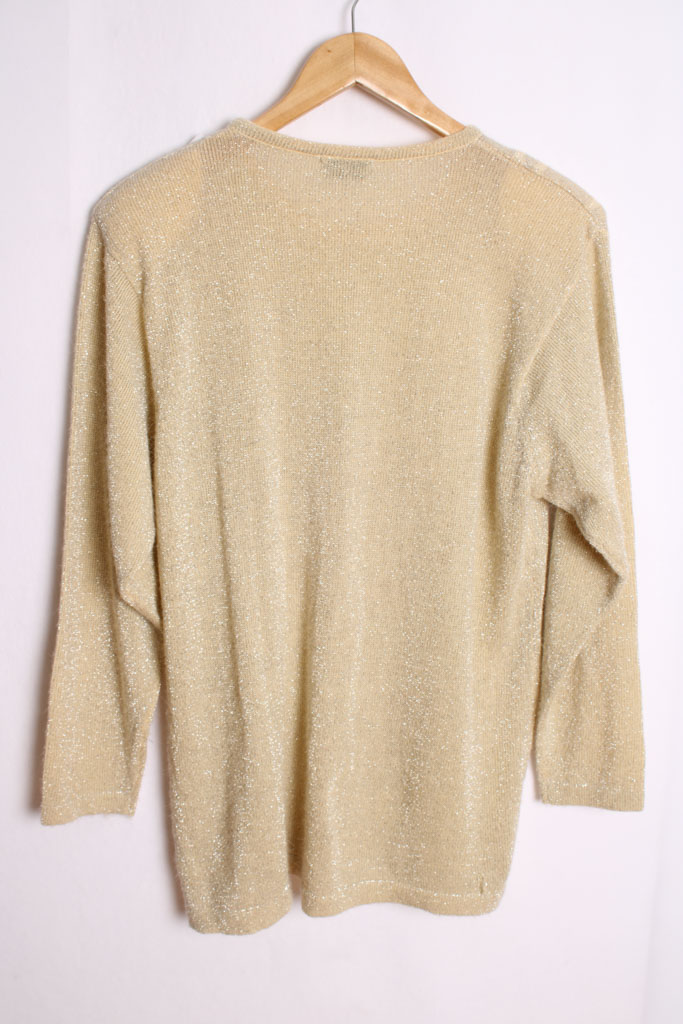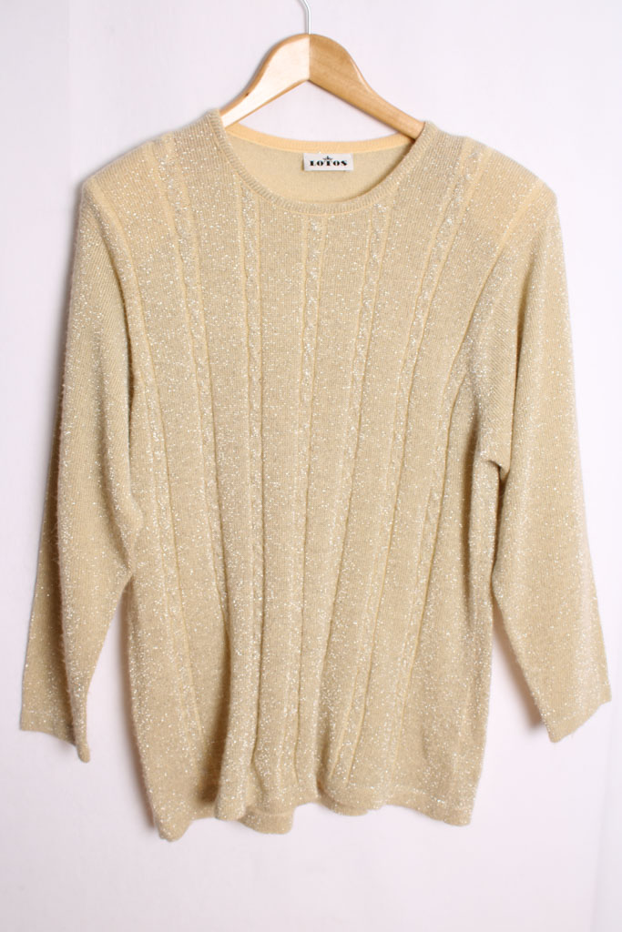 Jersey vintage para mujer color beige con tejido de brillos dorados y coletas.