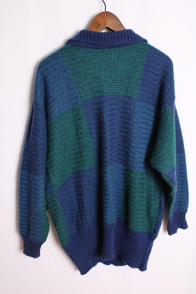 Jersey oversize en color azul y verde con cuadros. Escote en pico con cuello tipo polo y bolsillos.