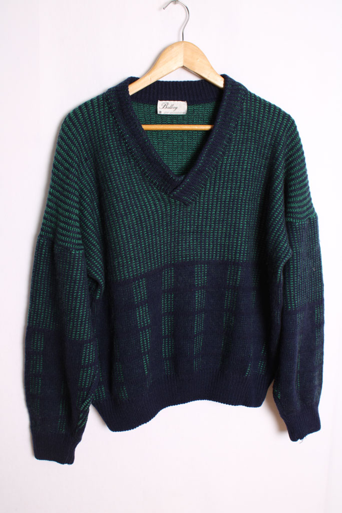 Jersey vintage con cuello de pico en colores azul y verde.
