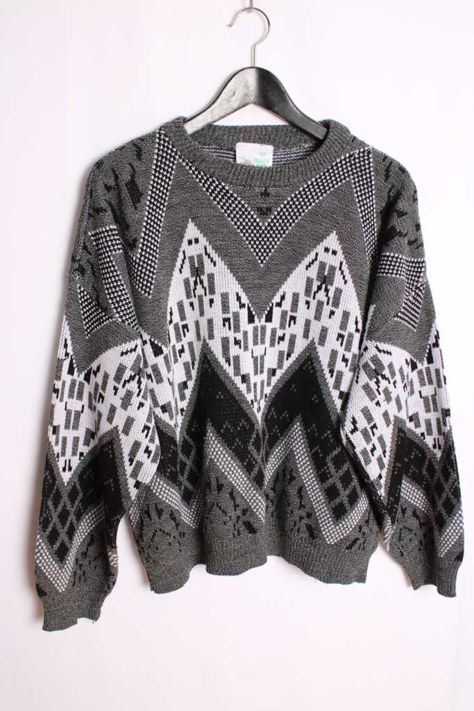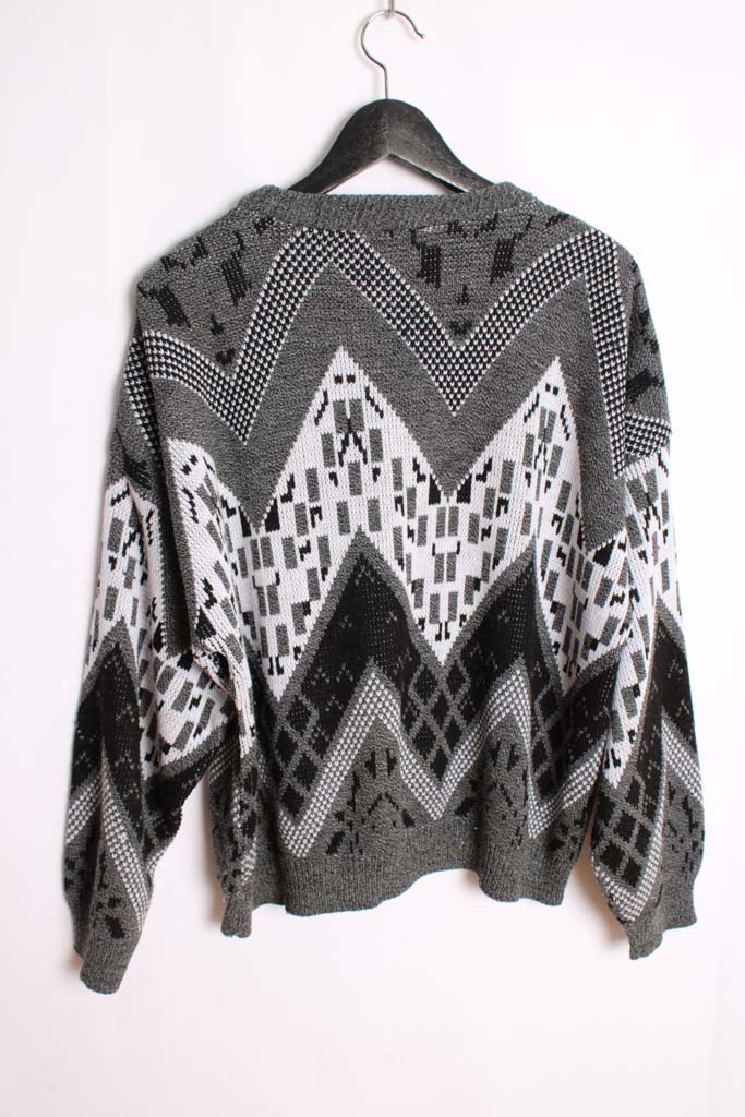 Cárdigan vintage para hombre en colores gris, negro y blanco con estampado geométrico.