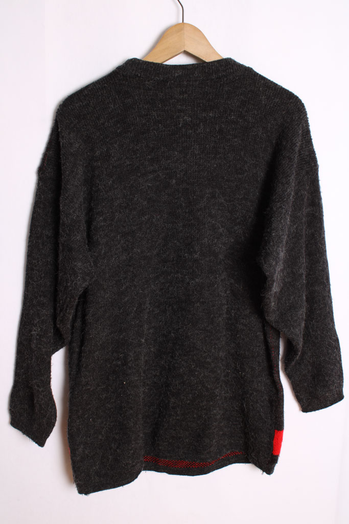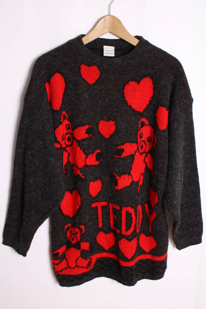 Jersey vintage para mujer en color gris jaspeado con estampado de ositos rojos.