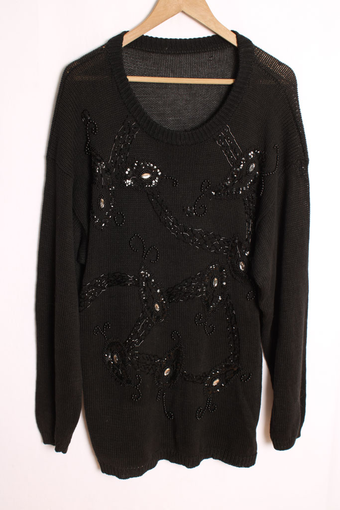 Jersey vintage para mujer en color negro con detalles de lentejuelas y pedrería.
