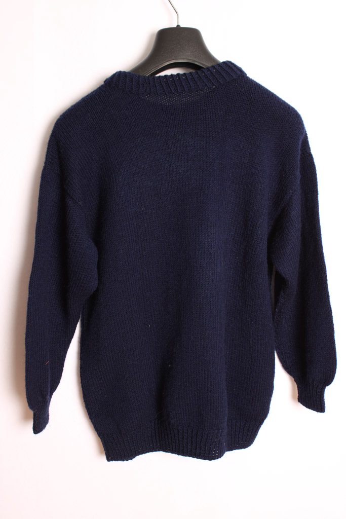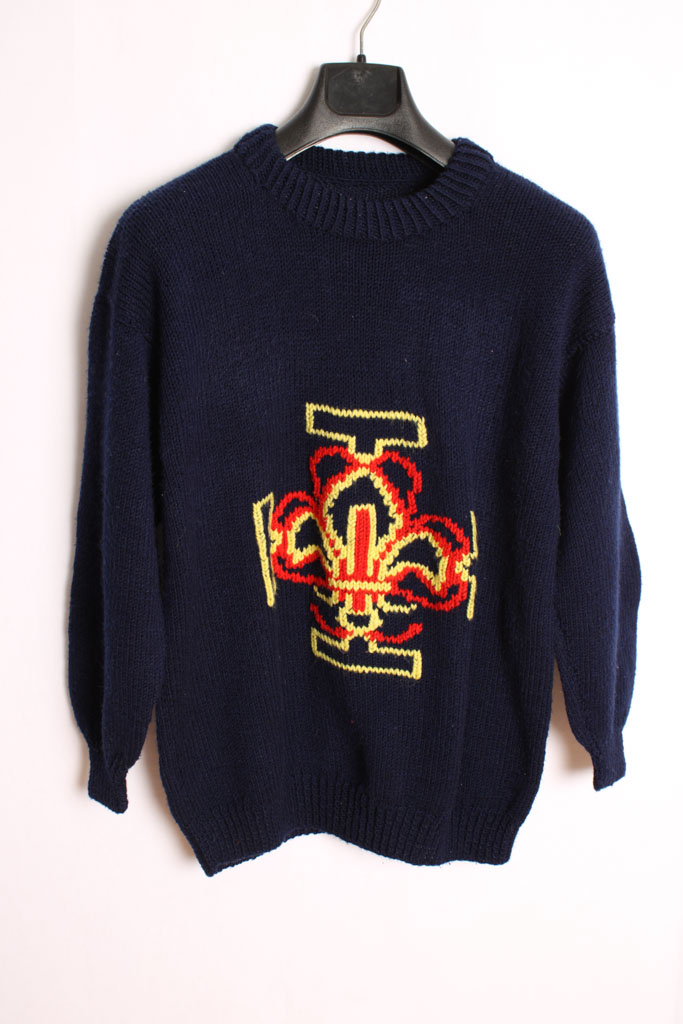 Jersey en color azul marino con dibujo en tono rojo y amarillo.