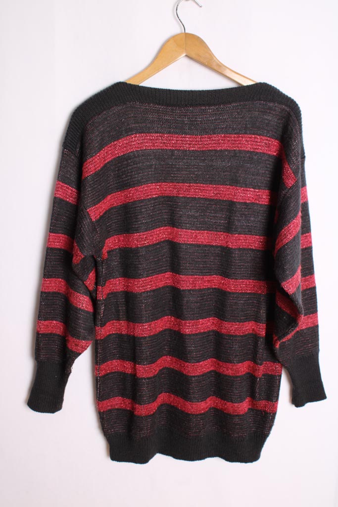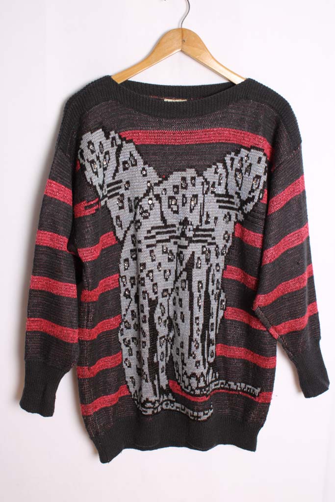 Jersey vintage para mujer con estampado de rayas fucsia y leopardos con detalles de lentejuelas.