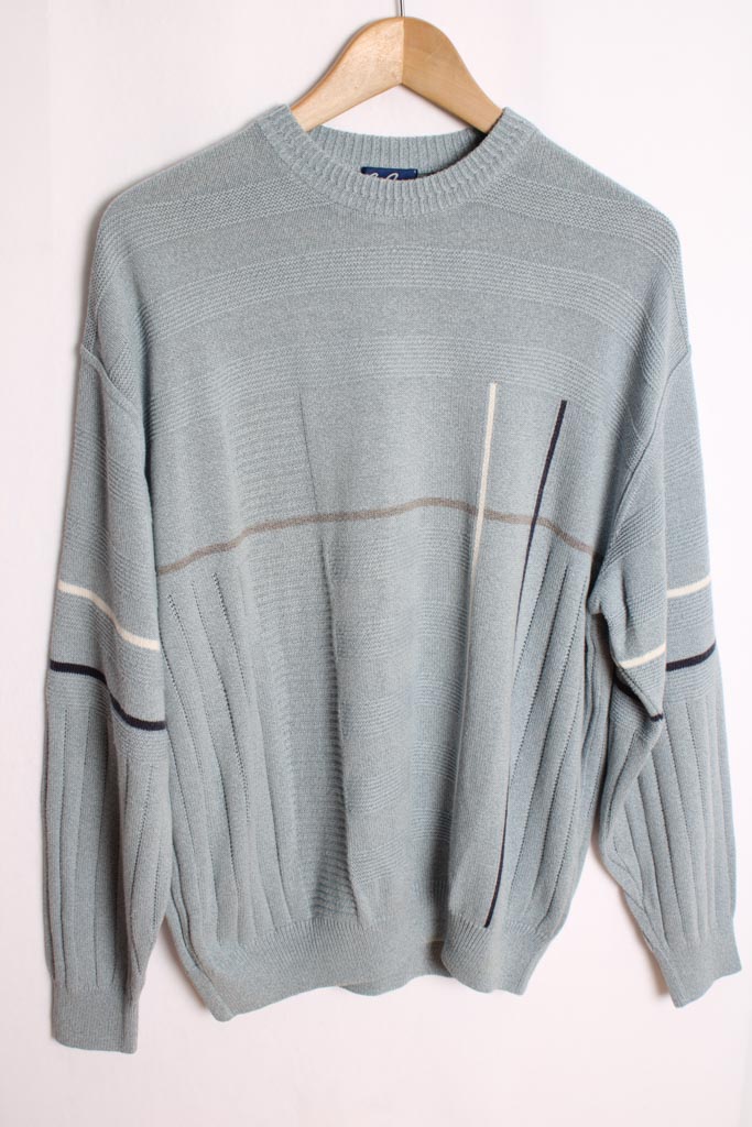 Jersey vintage para hombre en color azul celeste con cuello redondo y estampado de rayas.