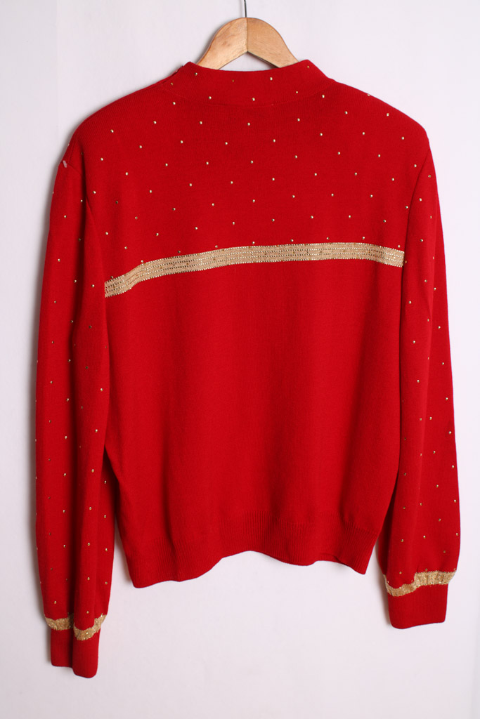 Jersey vintage para mujer en color rojo con cuello cerrado y detalles dorados.