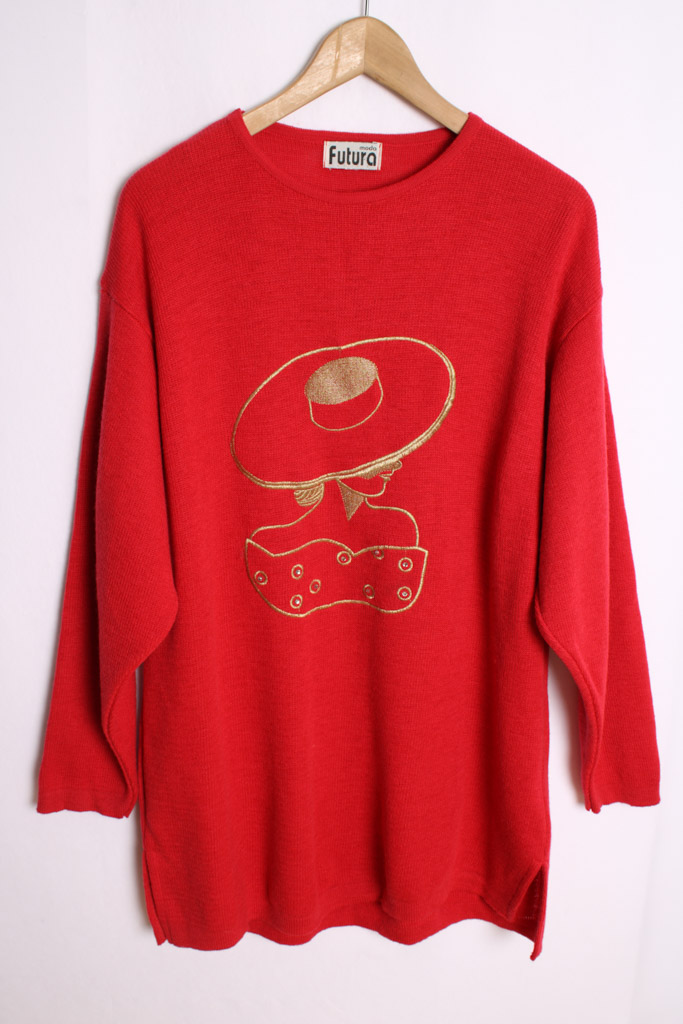 Jersey vintage para mujer en color rojo con mujer borada con sombrero en color dorado.