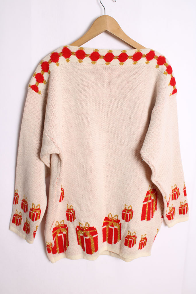 Jersey con cuello barco en tono blanco con estampado de perro y regalitos en tonos rojos y dorados.*