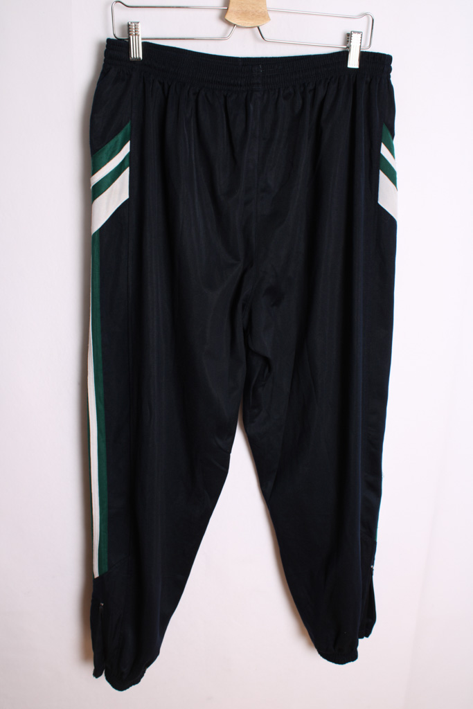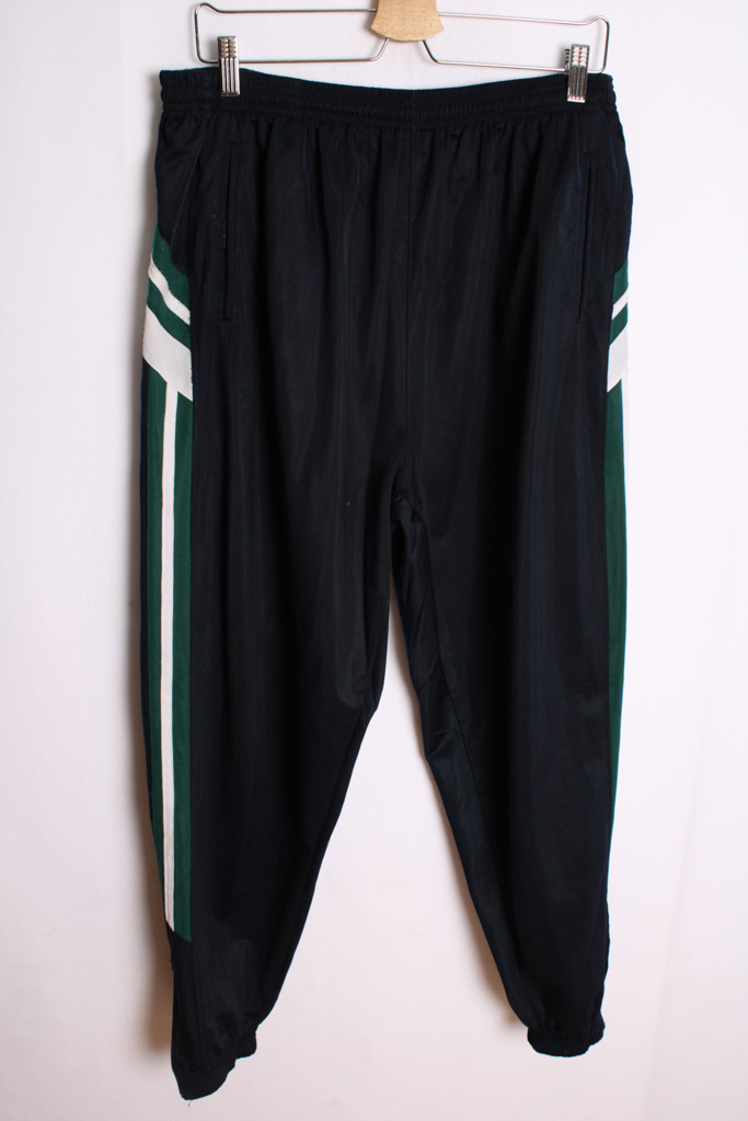 Pantalón deportivo vintage en color azul marino con detalles verdes y blancos.