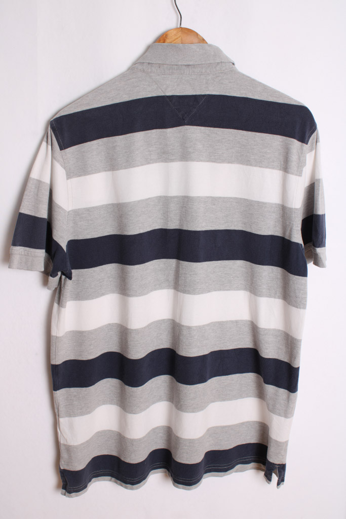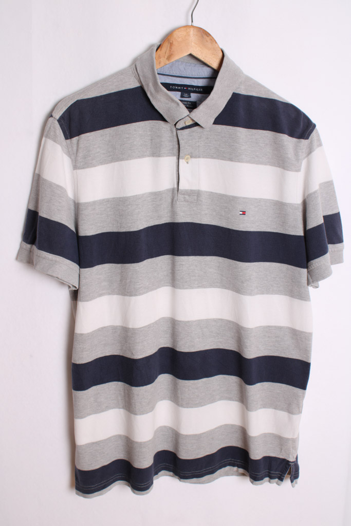 Polo vintage para chico de Tommy Hilfiger de rayas en tonos blanco, gris y azul marino.