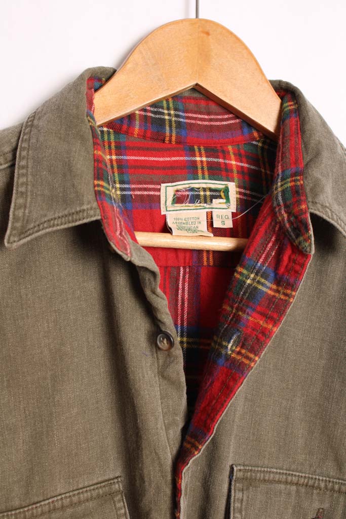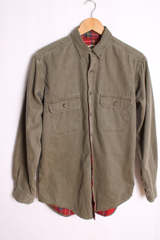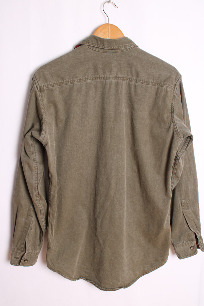Camisa vintage para hombre de loneta en color verde caqui con interior de franela roja.