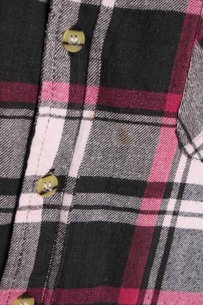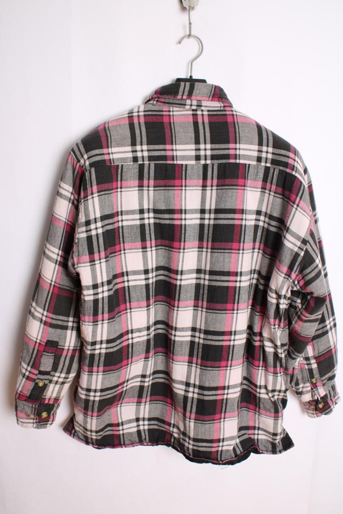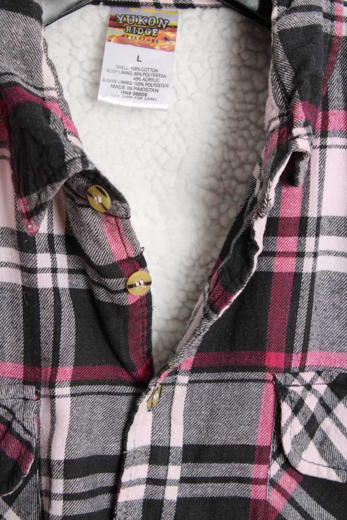 Sobrecamisa vintage para hombre de franela en cuadros de color negro, gris y rosados con interior forrado de borreguillo blanco.
