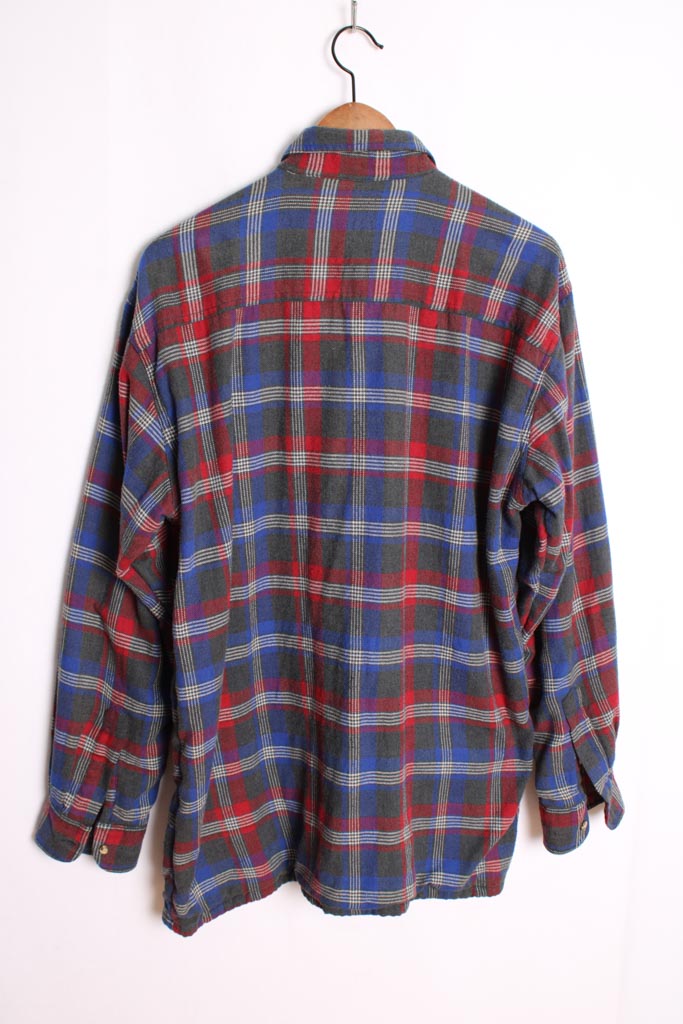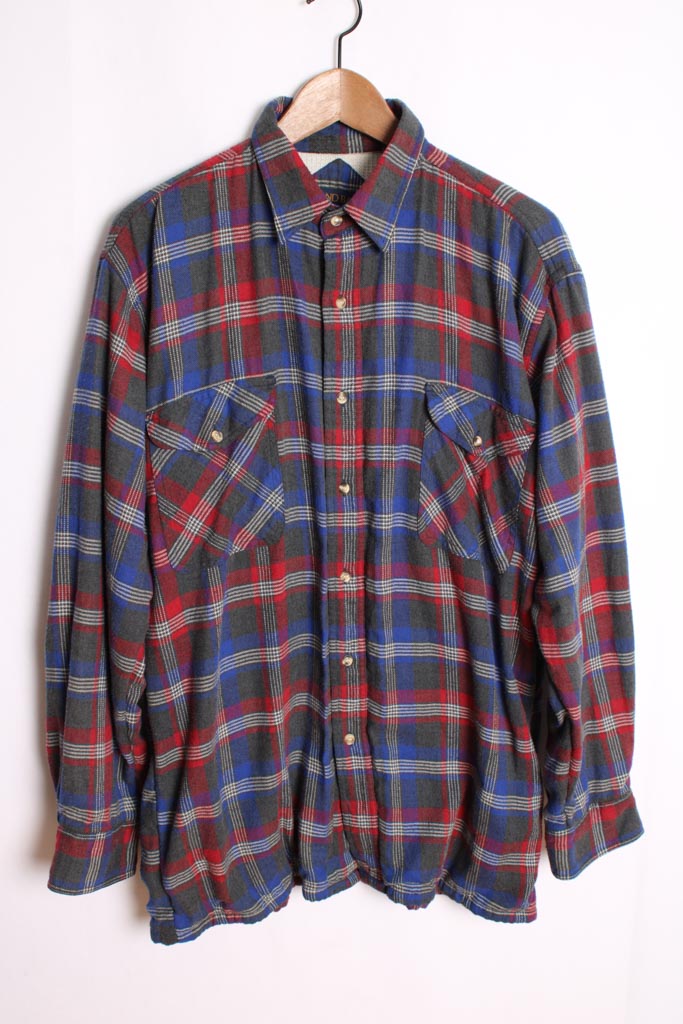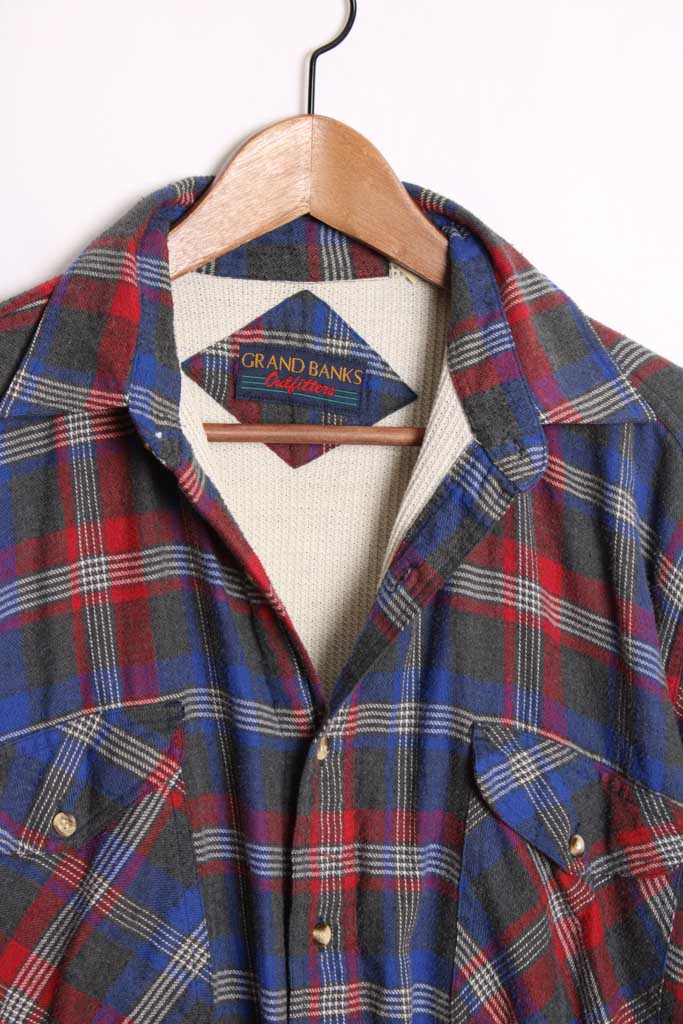 Sobrecamisa vintage de franela en cuadros de colores gris, azul y rojo con interior de toalla blanco.