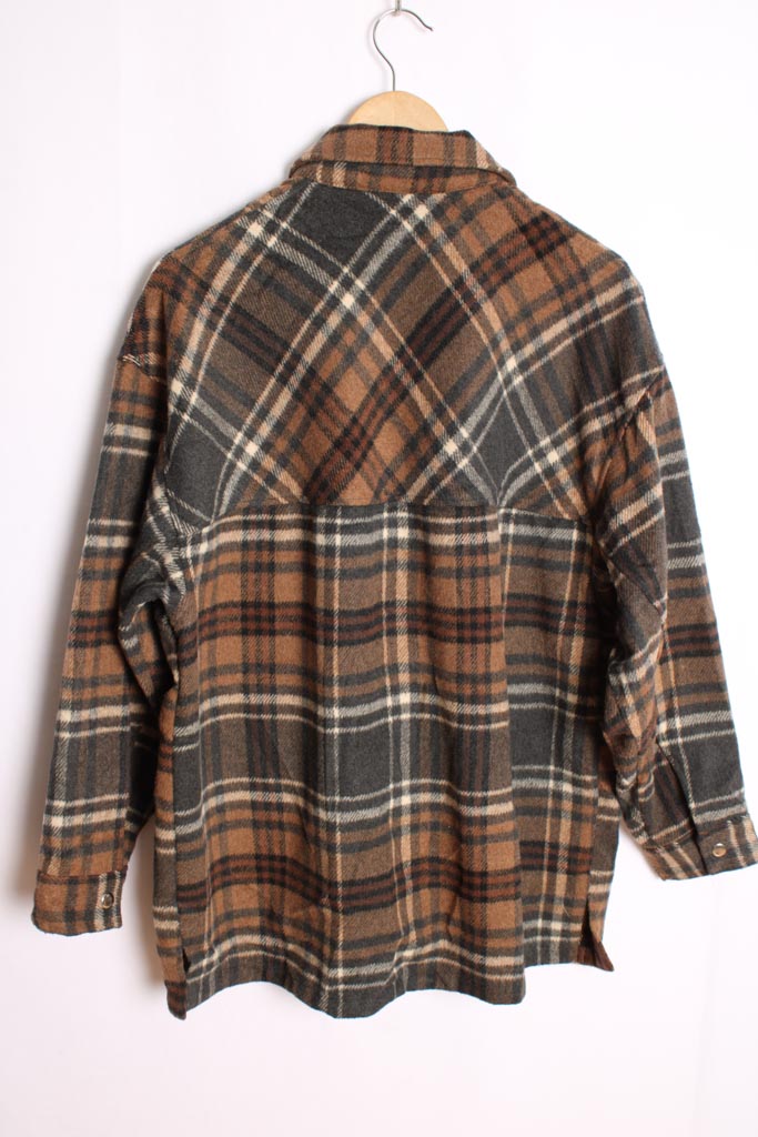 Sobrecamisa vintage de franela gruesa en cuadros de colores marrón y gris.