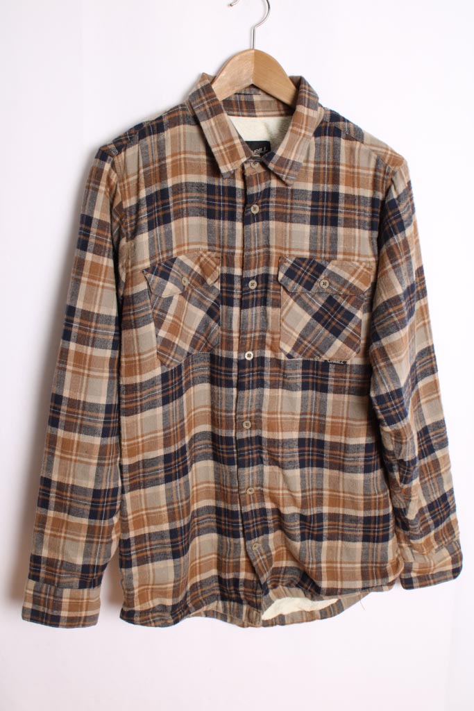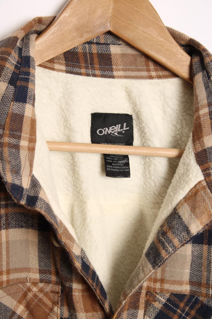 Sobrecamisa vintage para hombre de la marca O´neill en franela de cuadros de colores gris, marrón y azul con interior de borreguillo blanco.