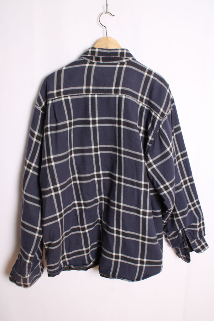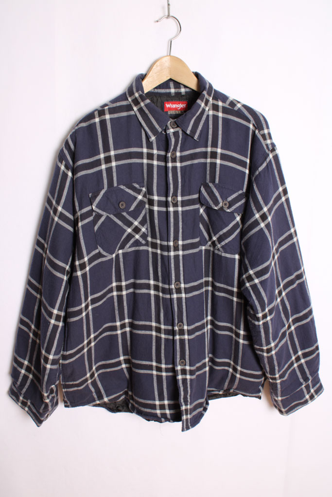 Sobrecamisa vintage de la marca Wrangler en franela en cuadros de color azul y blanco con interior forrado guateado azul.