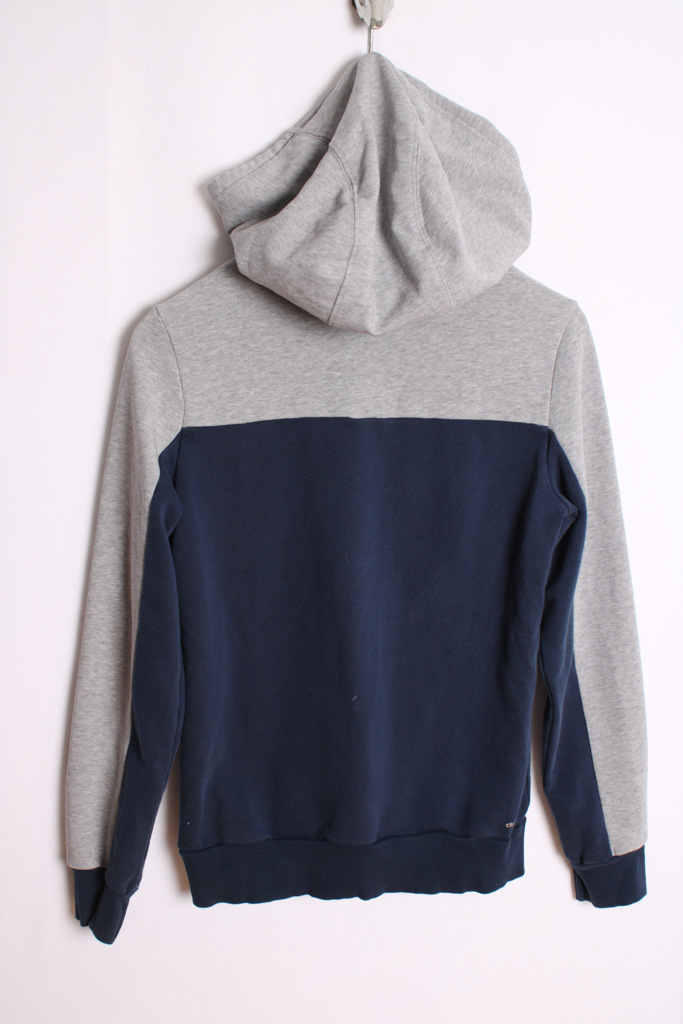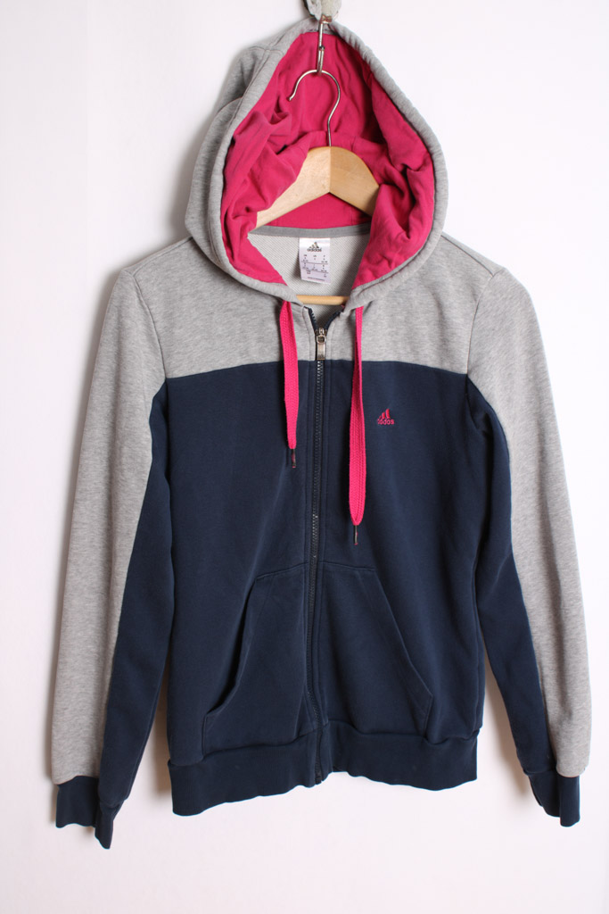 Sudadera con capucha vintage de la marca Adidas con cremallera central en colores azul marino, gris y fucsia.