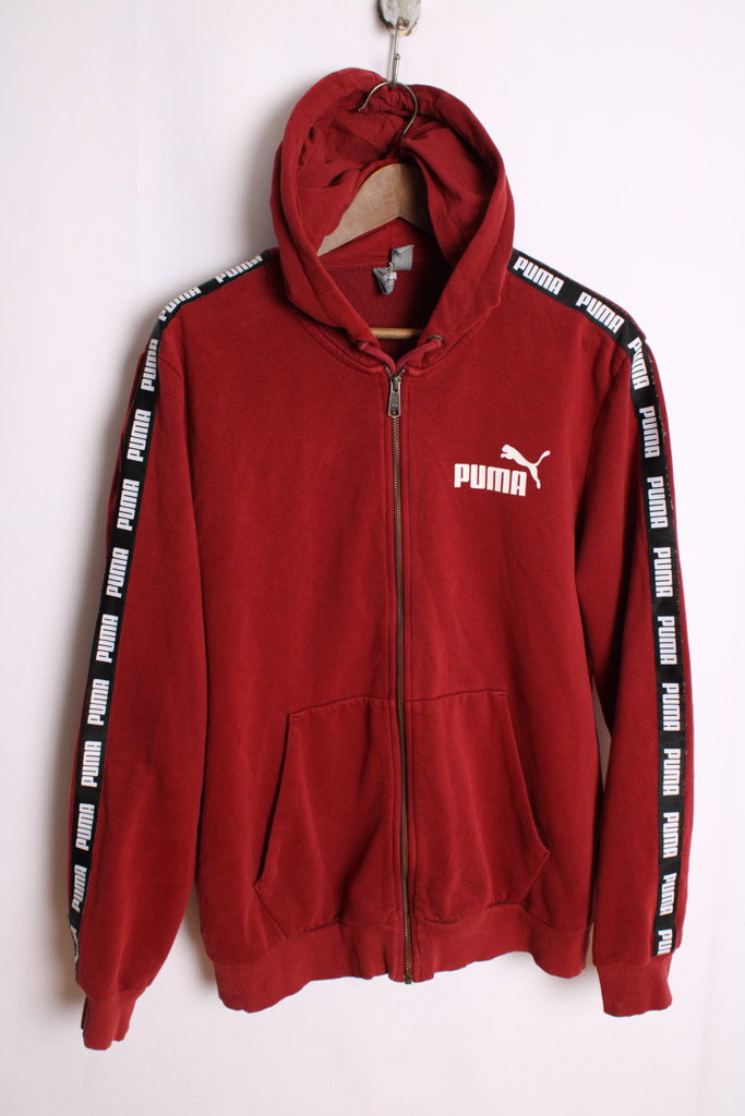 Sudadera vintage deportiva de la marca Puma en color granate con cremallera y capucha.
