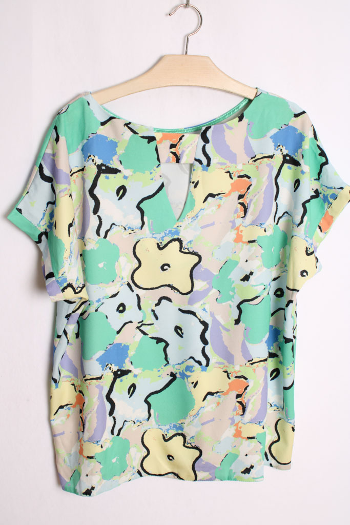 Top con estampado de flores ent onos amarillo, verde, lila… pastel.