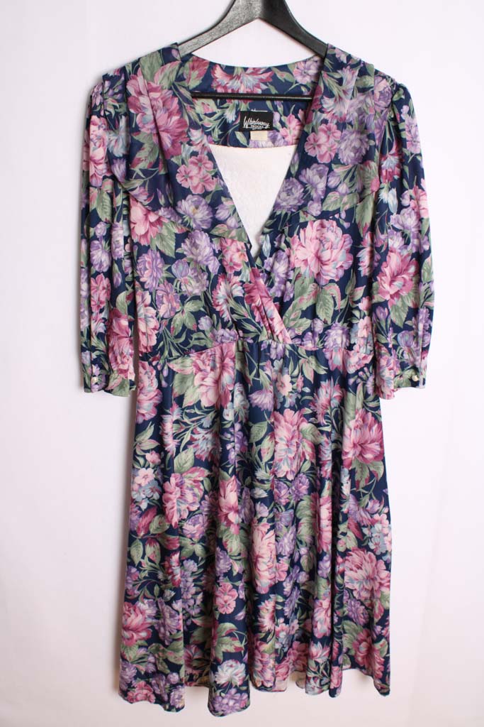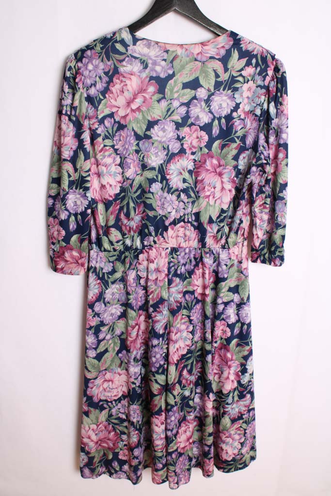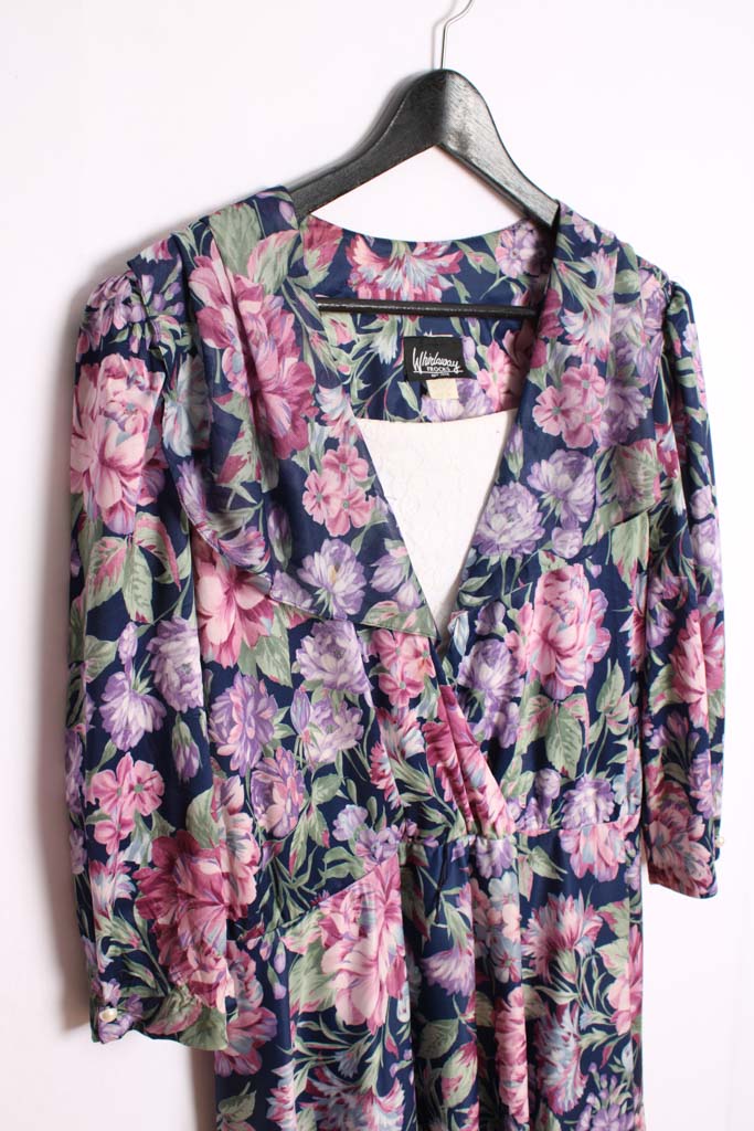 Vestido vintage americano en color azul con flores estampadas en tonos morados y fucsia.