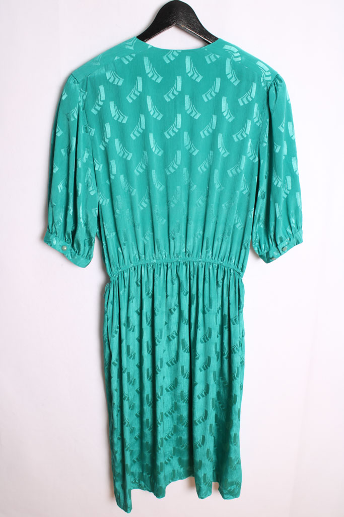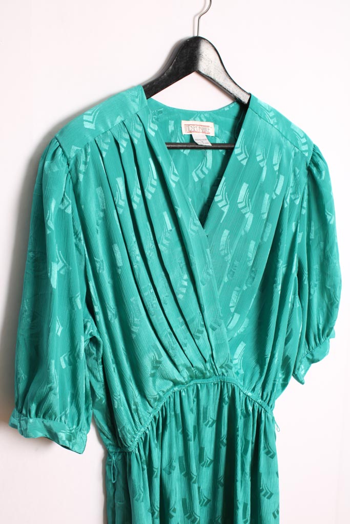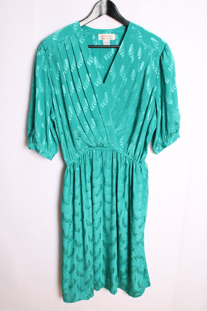 Vestido vintage americano en color verde esmeralda con escote plisado y falda plisada.