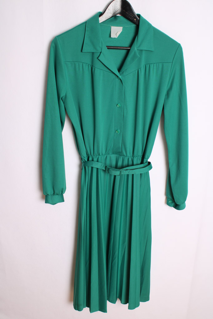 Vestido vintage de verano en color verde con manga larga y cinturón a juego.