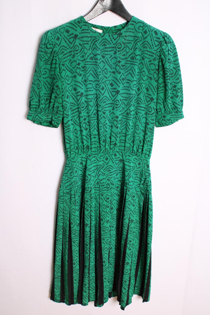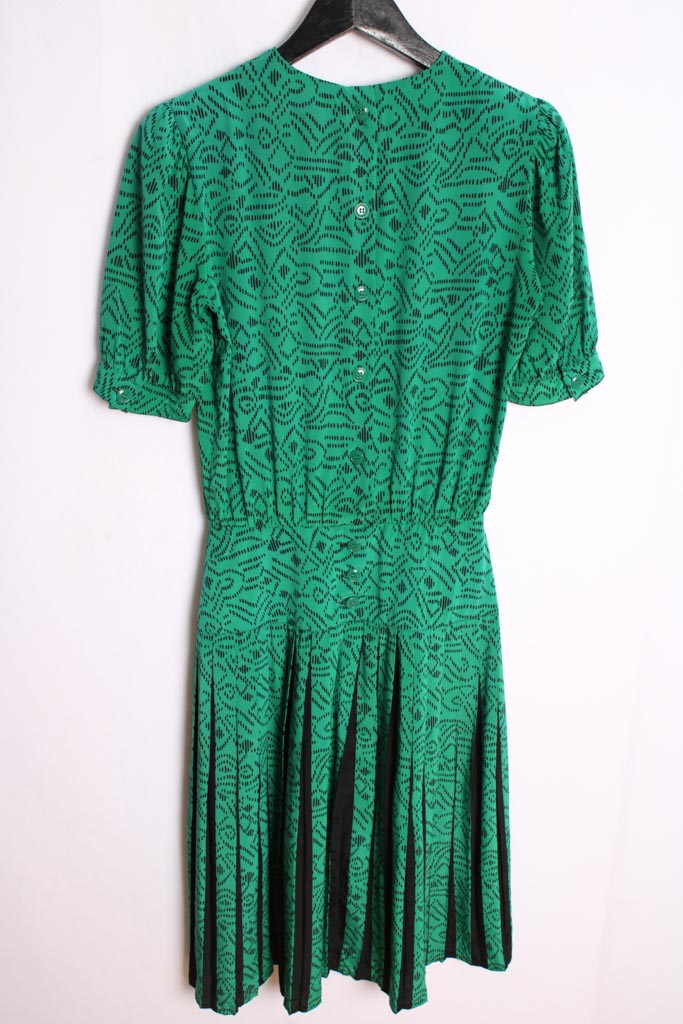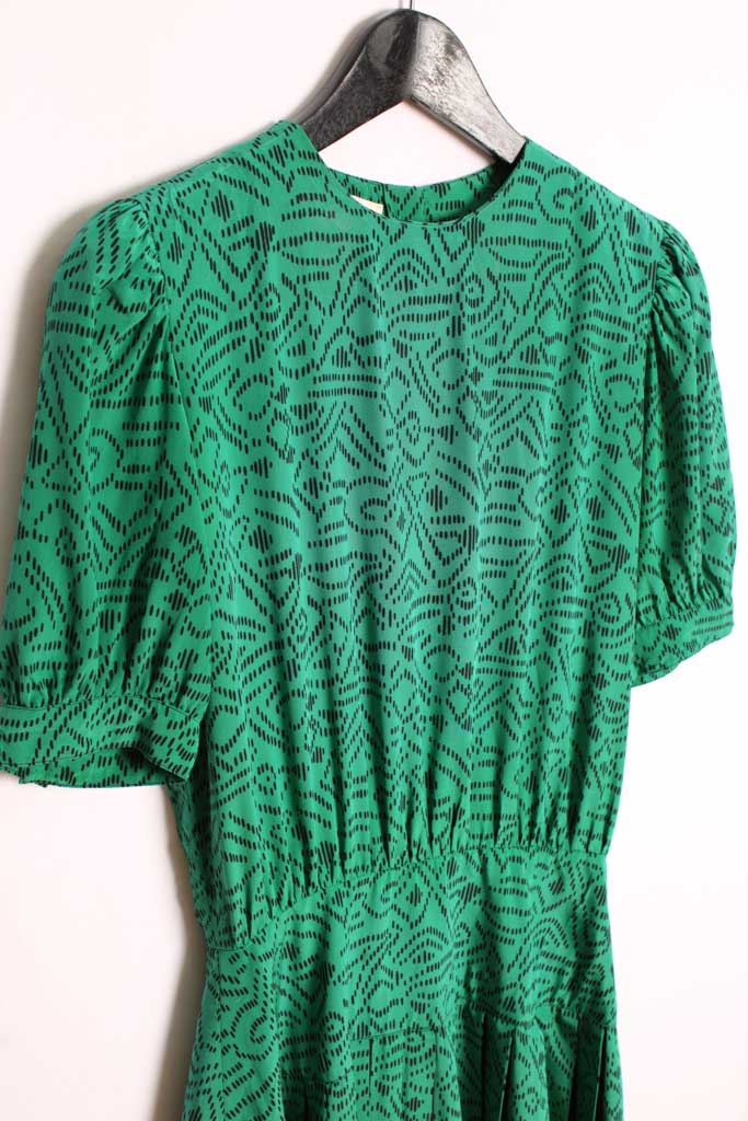Vestido de largo midi con falda plisada y manga corta farol verde con estampado en tonos negros.