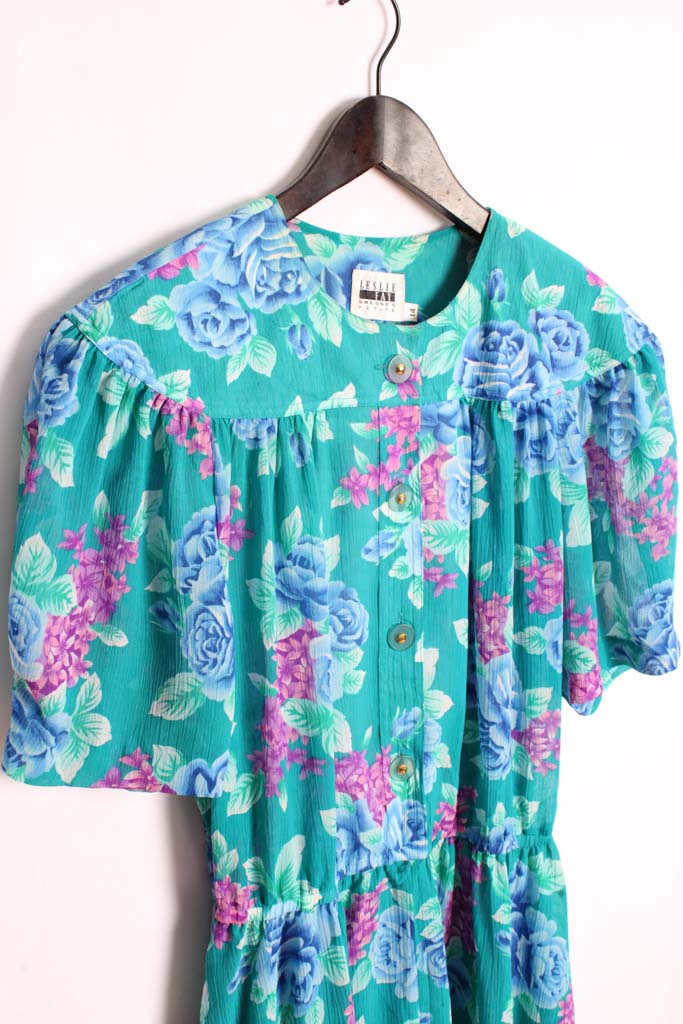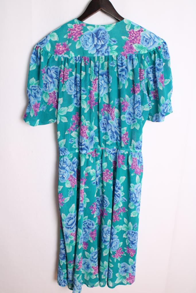 Vestido midi en color verde con estampado de flores en tonos rosas, morado, azul…