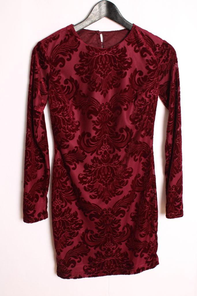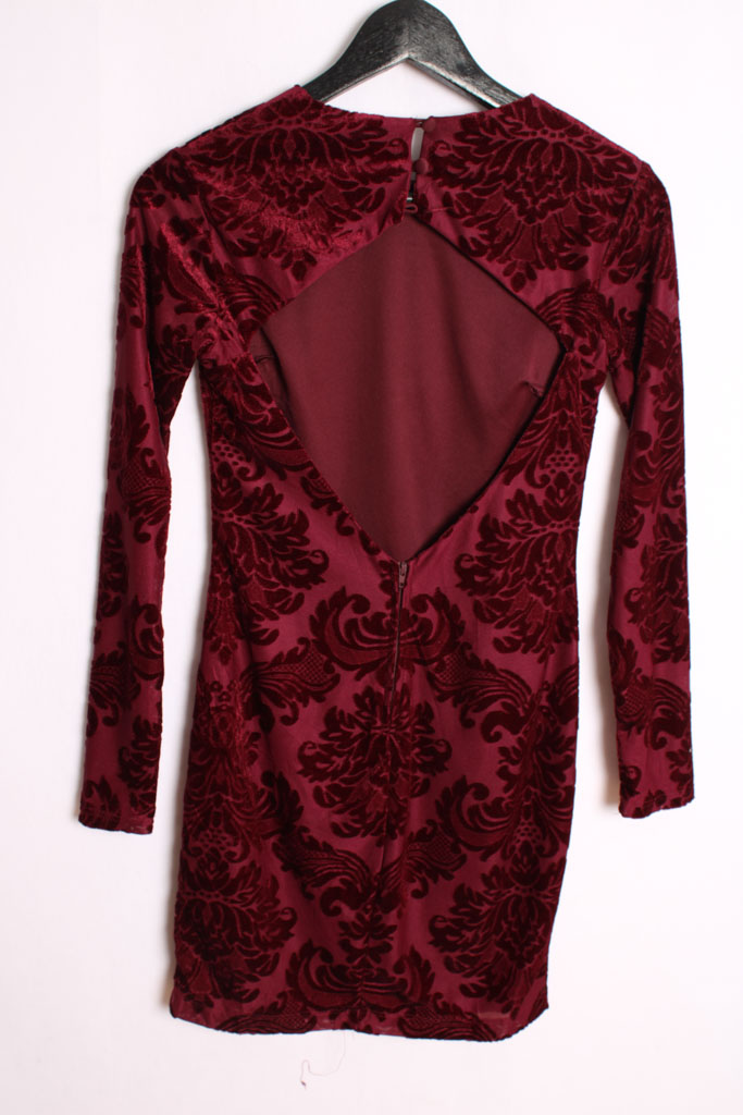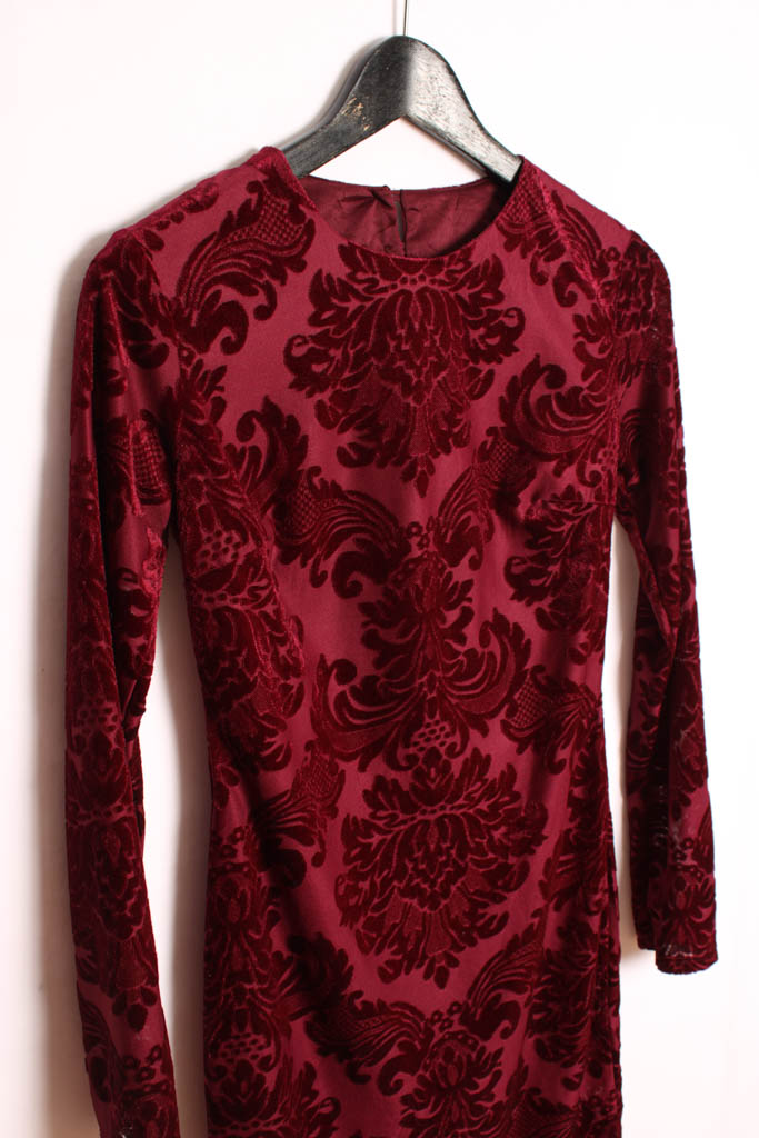 Vestido vintage de terciopelo en color burdeos y largo mini con estampado de flores y escote en espalda.