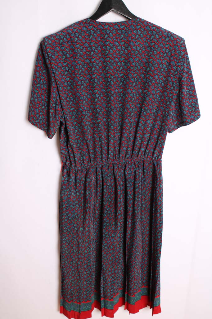 Vestido de largo midi de manga corta con falda plisada. En color rojo con estampado paisley en turques, azul..