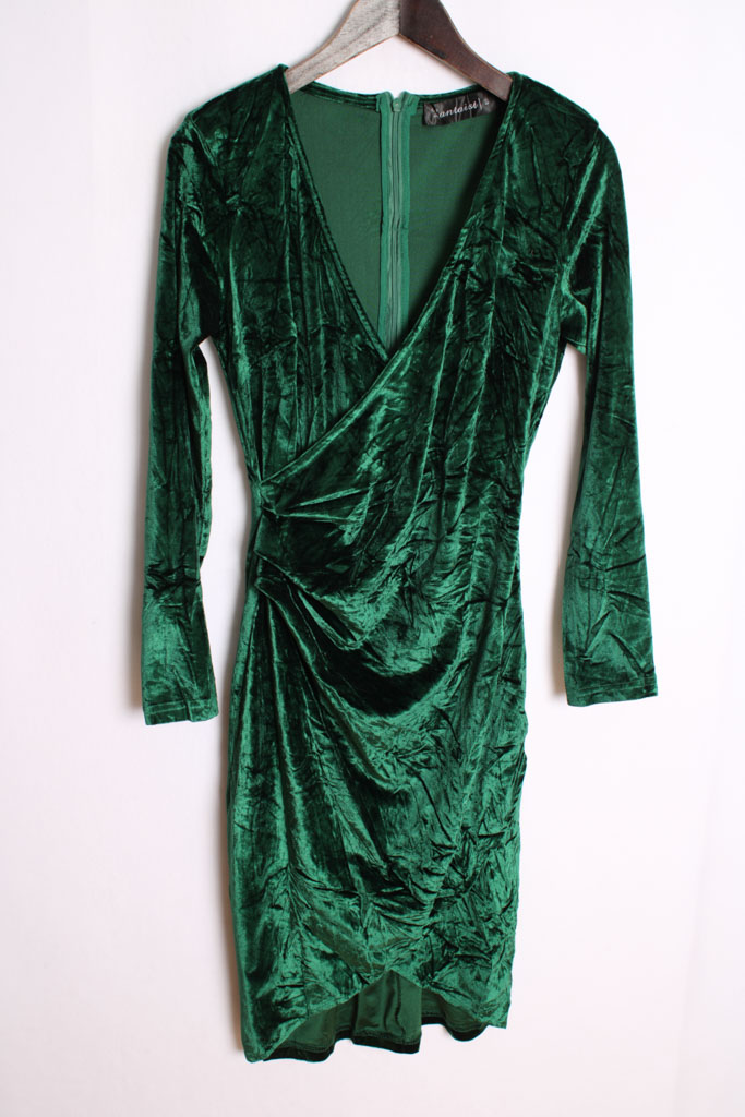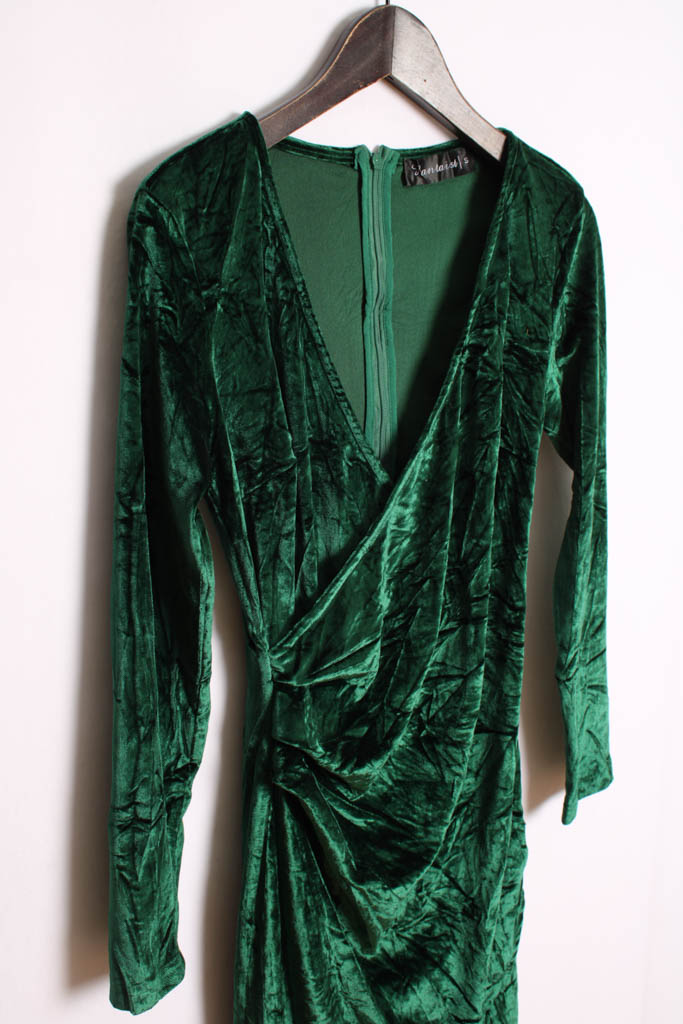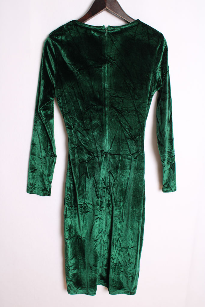 Vestido de terciopelo vintage en color verde de largo por la rodilla.