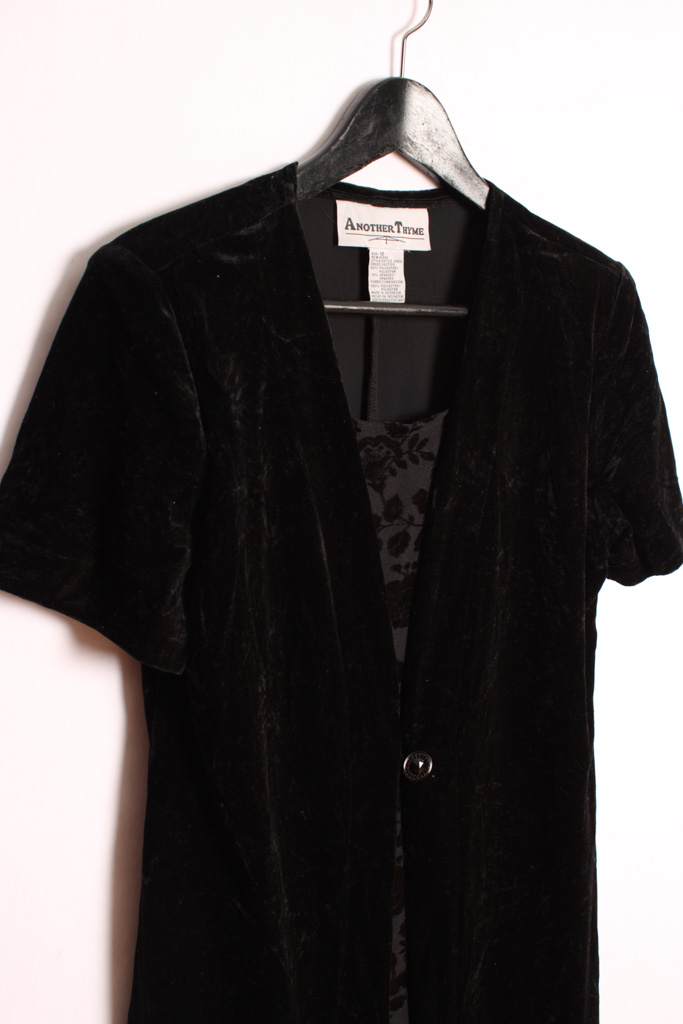 Vestido vintage de terciopelo en color negro con efecto chaleco y con interior de flores.